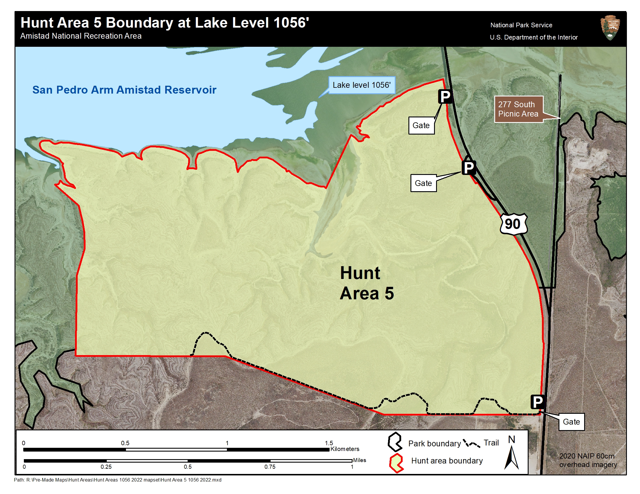 The south and east boundary is along and in line with a fence line marked with NPS boundary signs. The west boundary is in line with an old fence line and is marked with signs labeled “No Hunting/Trapping Beyond This Point.” The remaining boundary is the shoreline of the San Pedro Arm extending eastward to the Highway 277 Bridge. The hunt area does not extend out onto the exposed dry riverbed of San Pedro Creek.